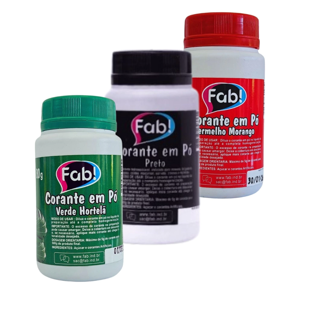 Detalhes do produto O Corante FAB em pó é um corante natural, 100% alimentício.É ideal para colorir alimentos, doces, bolos, tortas, cremes, geleias, e outras preparações. Pode ser usado para dar cor aos alimentos. O Corante FAB em pó é versátil e de rápida dissolução. Oferece uma cor intensa, estável e de longa duração.